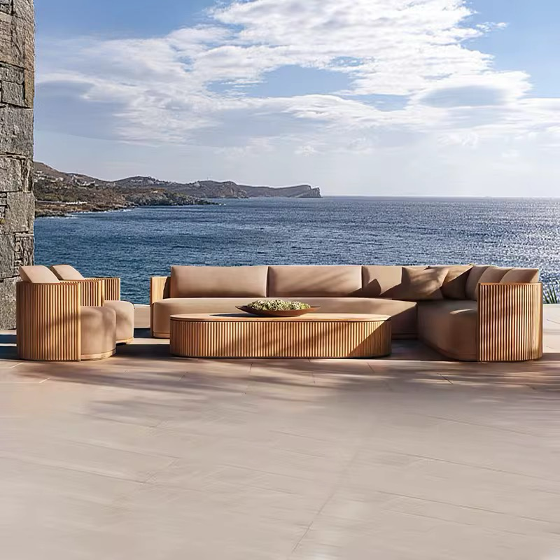 The Milos dining set redefines outdoor gatherings through sculptural simplicity and material warmth. Vertical wooden slats and rounded forms bring architectural rhythm to the space, balancing strength and softness in a naturally elegant composition.