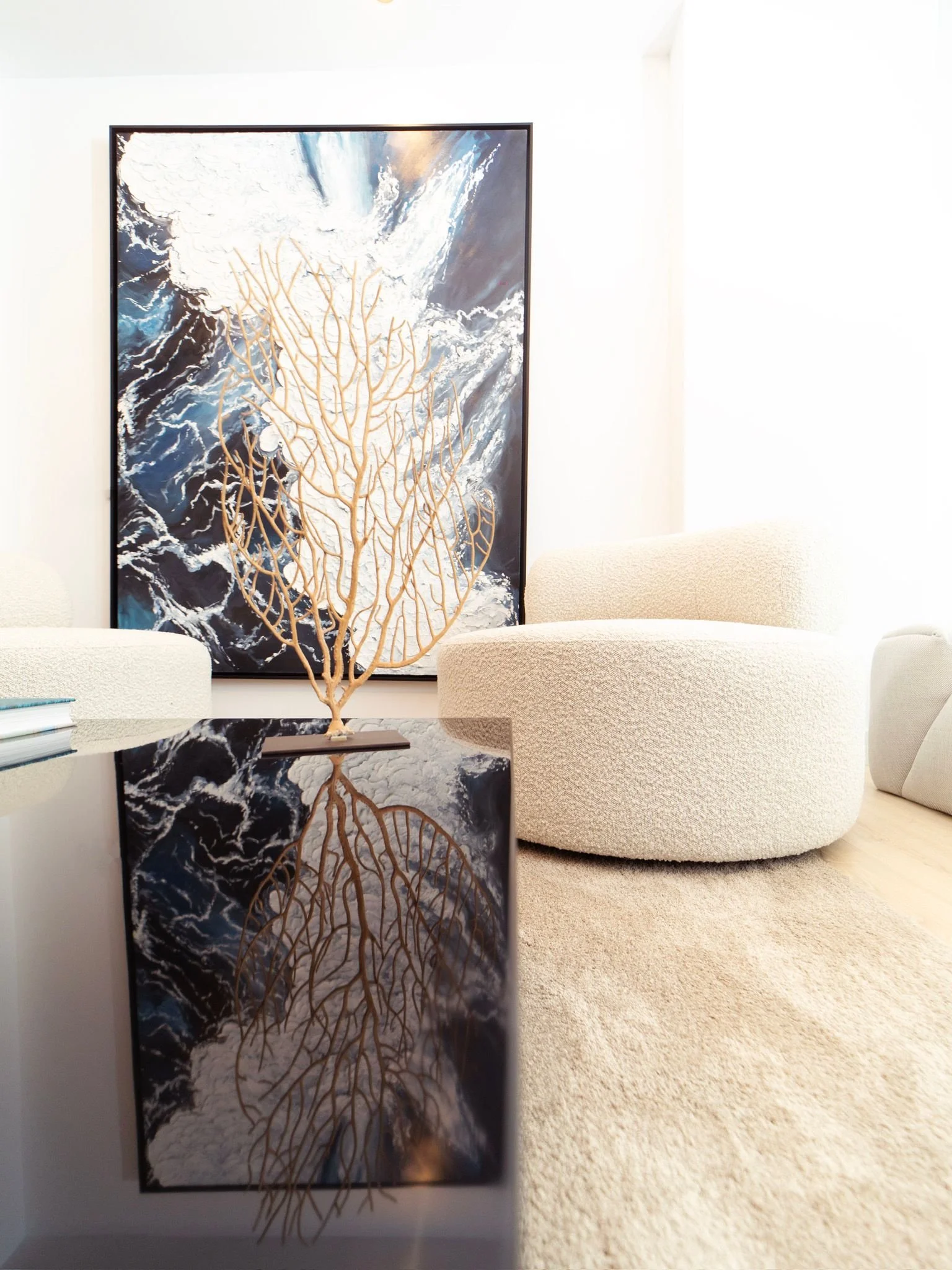 Art pieces, organic textures, and curated decorative accents bring personality without overwhelming the visual softness and balance that define the entire home.